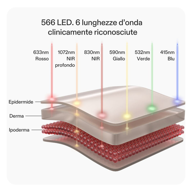 Vicino Infrarosso (830nm): Penetra in profondità, riattiva la rigenerazione cellulare.